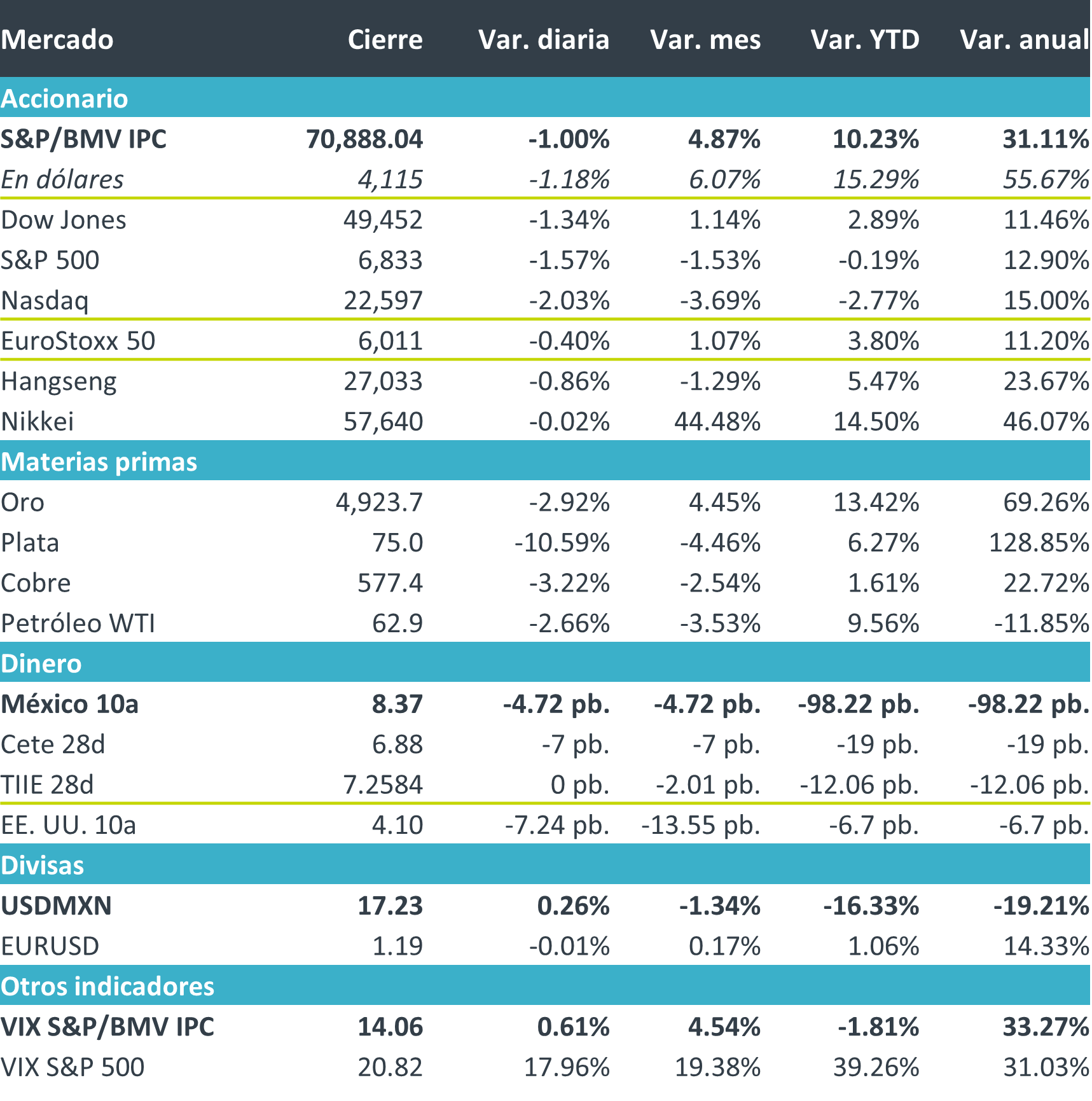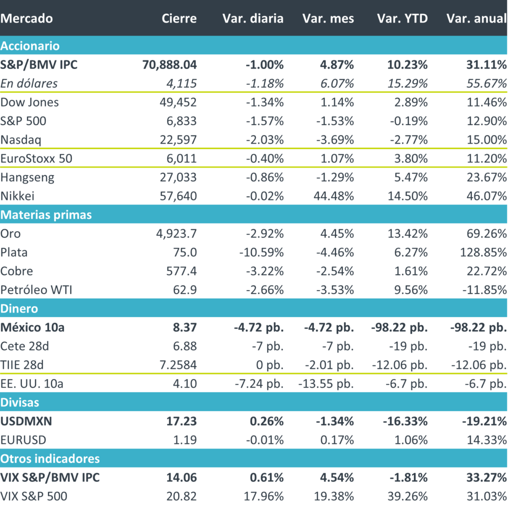 +Fue una jornada de caídas, encabezada por el escepticismo enraizado en torno a la IA. No obstante, esta vez no fueron las expectativas de rentabilidad de las emisoras que desarrollan dicha tecnología las que arrastraron al resto, sino que el ritmo acelerado de su avance comienza, según analistas, a amenazar los modelos de negocio de compañías de todos los sectores y tamaños. Esta disrupción se percibe con el vaso medio vacío: el mercado ahora no busca ganadores, sino posibles perdedores. Ese escepticismo derivó, de forma natural, en cautela: los flujos se dirigieron al mercado de deuda estadounidense como refugio, lo que se materializó en caídas generalizadas de activos de renta variable y metales preciosos.
