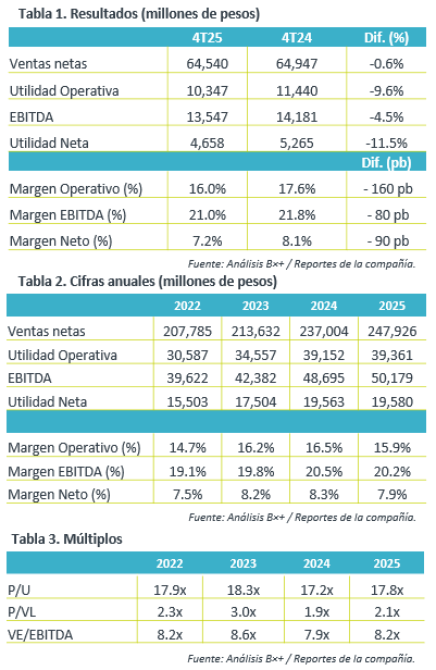 Datos 2025. De manera anual, las ventas netas aumentaron 4.6%, el EBITDA creció 3.0% y la utilidad neta tuvo un incremento marginal de 0.1% respecto al 2024.  Para 2026, se espera un ligero impacto por sensibilidad de precios por IEPS en México, pero mitigado por estrategia comercial de la empresa, sumado a un mayor dinamismo económico por el Mundial, buscando la eficiencia operativa con las inversiones del 2025.