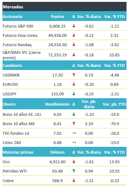 +Los futuros de los índices accionarios operan de forma negativa, regresando de un fin de semana largo y de una semana de liquidaciones. La temporada de reportes está en la recta final, en donde más del 73% de las empresas del S&P 500 han presentado sus reportes, con el 74% por arriba de lo esperado. Los mercados en Europa están mixtos, donde el Euro Stoxx 50 cae 0.4%, siendo el sector industrial el más afectado. En Asia, el Nikkei japones bajó 0.4%. En materias primas, el crudo sube 0.94%, centrándose en temas geopolíticos, mientras que el oro cae 1.4%. El tipo de cambio se deprecia 0.19%, cotizando durante la madrugada en un rango entre MXN$17.22-17.16. El índice dólar sube 0.36%. El rendimiento del bono del tesoro a 10 años se ubica en 4.03% bajando 2.10 pb, cotizando en mínimos desde noviembre, en línea con la moderación en el apetito por riesgo y las expectativas de un relajamiento monetario del Fed.