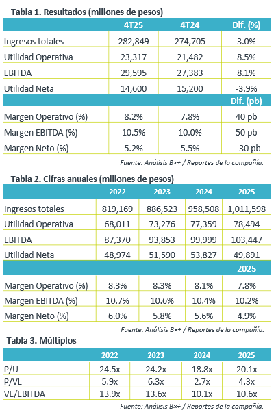 Rentabilidad. Luego de algunos trimestres con presiones en sus márgenes operativos, este 4T25 de observa una mejora debido a eficiencias implementadas por la empresa, llevando un crecimiento de 8.5% a/a en utilidad operativa y de 8.1% a/a en EBITDA. Sin embargo, se reportó un incremento de 102.8% a/a en impuestos a la utilidad, lo que impactó la utilidad neta del trimestre.