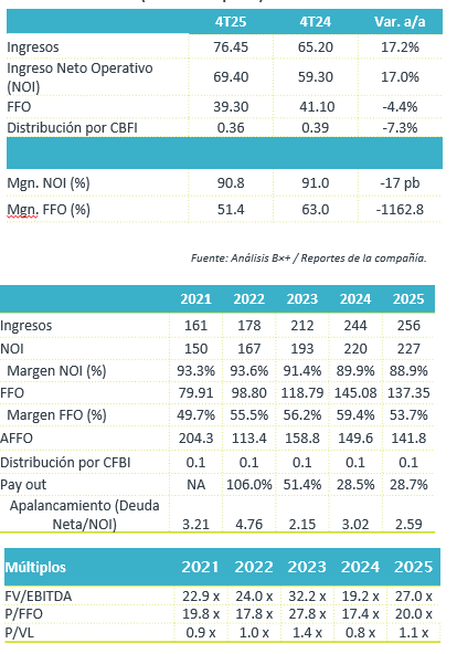 Mejor operación del negocio. En el 4T25, el resultado Operativo Neto ajustado incrementó 17.0% a/a, así miso el margen NOI fue de 90.8%, decreciendo 17 pb, pero en el ajustado incrementa de 93.7% a 94.6% gracias a mayores ingresos por rentas y costos relativos más bajos.