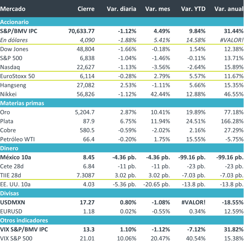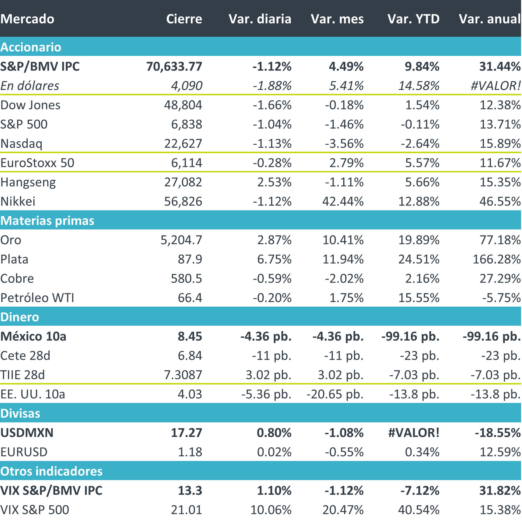 +En cuanto a materias primas, el petróleo retrocede marginalmente, mientras que el oro supera los 5,200 dólares; demostrando aversión al riesgo.