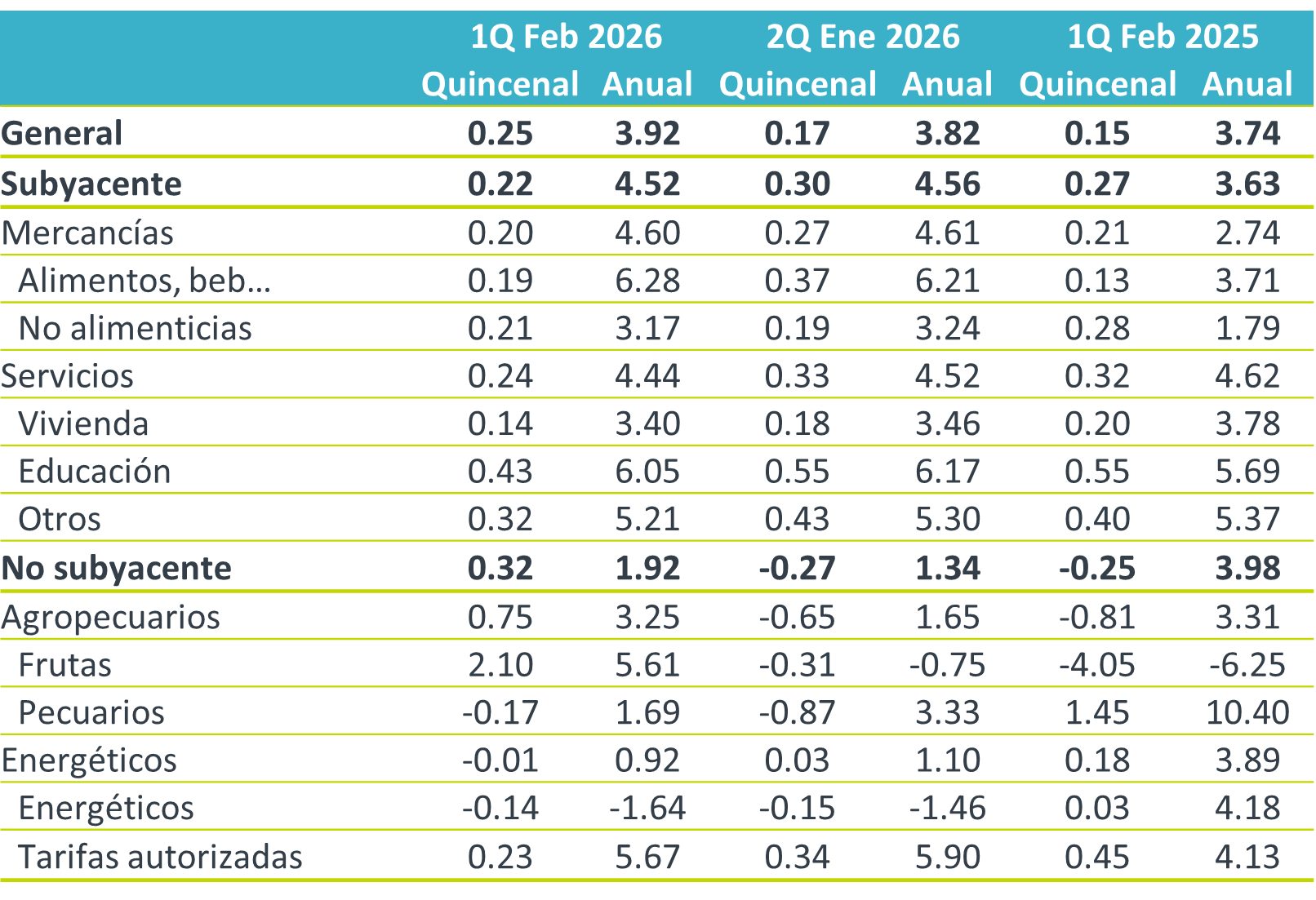 Presentó su mayor variación para una primera quincena de febrero en tres años. La presión se originó del índice no subyacente, donde el alza en frutas y verduras eclipsó los retrocesos en productos pecuarios y energéticos. La variación del subyacente fue la menor para una misma quincena desde 2021, gracias a un crecimiento algo menor a lo usual en mercancías no alimenticias, mientras que en los servicios se observó algo de presión en educación, lo cual es usual al inicio de cada año.