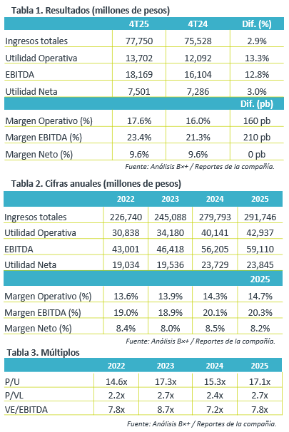 Resiliencia en Volumen. Coca- Cola FEMSA reportó que el volumen aumentó 1.3% a/a en el 4T25 hasta 1,093.6 millones de cajas unidad, ante las presiones en el volumen en México y Centroamérica que permaneció estable (-0.0% a/a) compensado por el aumento de 3.0% a/a en Sudamérica.