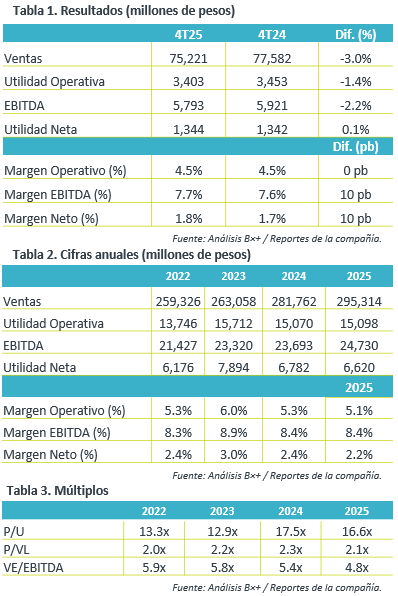 Rentabilidad. Aunque la utilidad operativa disminuyó 1.4% a/a en el trimestre, ante la presión en las ventas, el manejo eficiente en promociones e inventarios en México, y los beneficios Centro de Distribución en Estados Unidos, permitieron la estabilidad en los márgenes operativos. Por otro lado, el resultado integral de financiamiento permaneció estable, aunque se reportó un mayor pago de impuestos a la utilidad, por lo que la utilidad neta aumentó marginalmente 0.1% a/a en el 4T25.