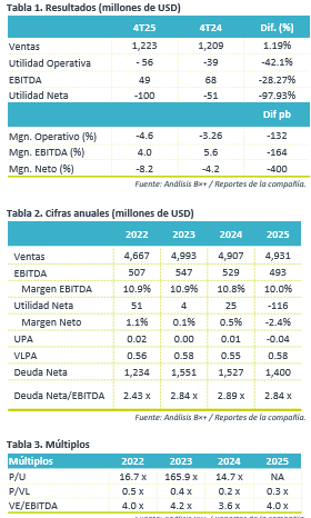 Flujo se deteriora. La compañía presentó una pérdida operativa como consecuencia de un deterioro en activos y gastos de reorganización, en EBITDA presentaron un decremento de 28.2% a/a por gastos extraordinarios de lanzamiento y efectos cambiarios, así como una alta base de comparación.