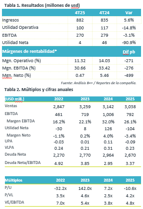 - Por debajo de lo esperado. Al 4T25, la compañía presentó un reporte débil, con un retroceso generalizado, así mismo vemos afectaciones en márgenes.