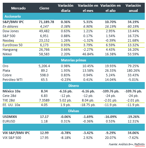 +El precio del petróleo (WTI) cayó 0.23%, finalizando en $65.5 dpb, el foco continua en las tensiones entre Irán y EE.UU., por otro lado, el oro presentó un incremento de 0.4% terminando en un precio de $5,206.4 por onza.