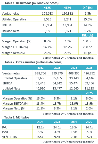 Rentabilidad. En el 4T25, la utilidad neta aumentó 1.2% a/a, rompiendo la racha de 11 trimestres de contracciones, ante la recuperación en utilidad operativa, que compensó el incremento de 20.6% a/a en el gasto financiero por mayores pérdidas cambiarias y mayores impuestos a la utilidad (+20.8%). De esta forma, el margen neto solo mejoró 10 pb hasta 3.1%.