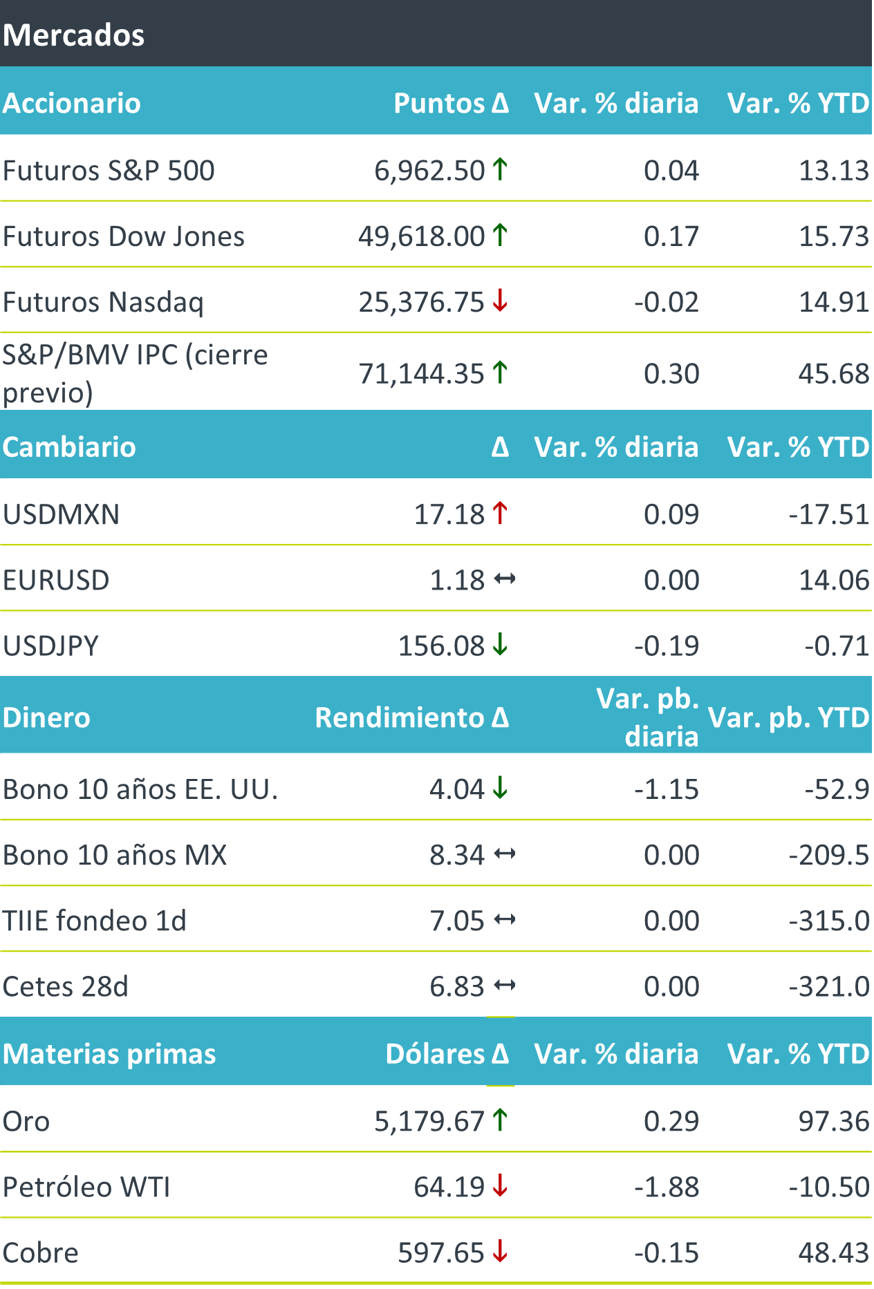 +Los futuros de los índices accionarios estadounidenses operan mixtos, asimilando los resultados ambiguos de Nvidia y Salesforce, a lo que se suman las tensiones geopolíticas entre Irán y Estados Unidos. El rendimiento a 10 años de los bonos del tesoro disminuyó marginalmente, en línea con la mayor preferencia por activos seguros. El índice dólar se debilita marginalmente (-0.07%), aunque el movimiento dentro de la canasta de divisas muestra divergencia: el yen cede terreno, mientras la libra esterlina y el franco suizo se consolidan sin ganancias adicionales de las principales divisas, destacan los avances de monedas duras contra el dólar. El USDMXN rebota nueve cts. esta mañana, si bien continúa cerca de mínimos del año. Los precios del petróleo WTI bajan, manteniéndose los inversionistas cautelosos pese a incertidumbre en Irán, apoyados por reportes de que la OPEP considera aumentar producción en su próxima reunión; el oro, por su parte, aumenta, en línea con búsqueda de refugio.