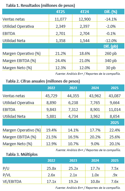Cifras anuales. En el 2025, el volumen total cayó 4.4%, resaltando el -7.1% de EE.UU. y Canadá, así las ventas netas disminuyeron 2.0% a/a,  el EBITDA aumentó 23.7% y la utilidad neta se expandió 118.4%, como resultados de un mejor desempeño operativo. Hacia 2026, continúa un escenario adverso para el consumo en EE.UU. Que podría ser mitigado por un mayor dinamismo por el Mundial en la primera mitad del año.