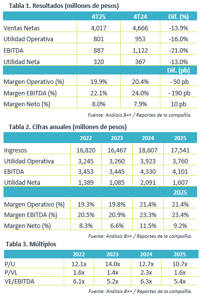 Cifras anuales. Las ventas netas disminuyeron 5.7% en 2025, el EBITDA cayó 4.0% y la utilidad neta se contrajo 23.1% respecto al 2024. Para 2026, se espera que las iniciativas de innovación y productividad en que se ha invertido favorezcan los fundamentales de la compañía, sumado a un entorno de consumo más optimista.