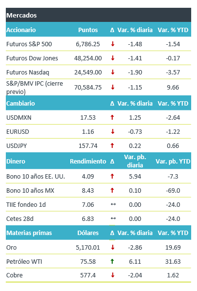 +Consideramos que la jornada de hoy podría continuar volátil, ante la posibilidad de que le conflicto en Medio Oriente se prolongue. Cabe mencionar que la amenaza por parte de Teherán de atacar buques que intenten transitar el Estrecho de Ormuz está causando estragos en los precios de materias primas, así mismo se incrementa la preocupación de que el aumento en precios del petróleo complique las decisiones de política monetaria del Fed a raíz de potenciales presiones inflacionarias en productos energéticos.