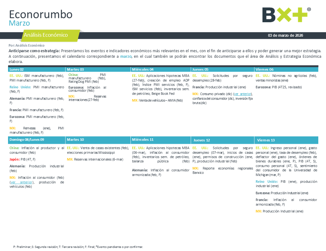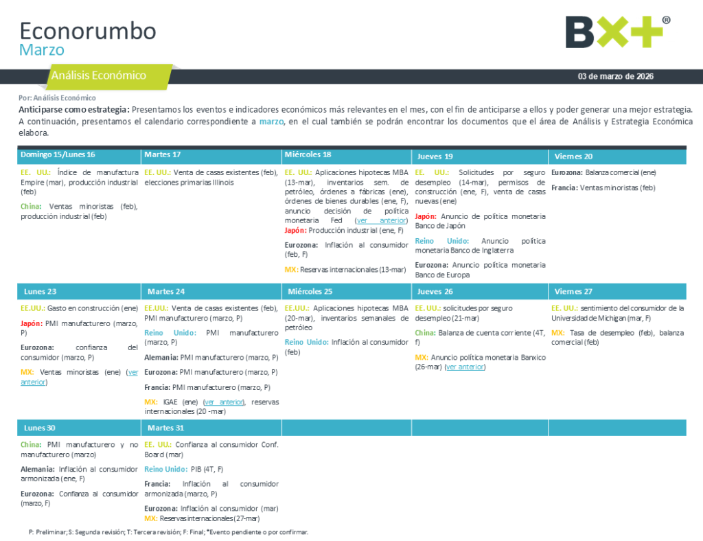 Anticiparse como estrategia: Presentamos los eventos e indicadores económicos más relevantes en el mes, con el fin de anticiparse a ellos y poder generar una mejor estrategia. A continuación, presentamos el calendario correspondiente a marzo, en el cual también se podrán encontrar los documentos que el área de Análisis y Estrategia Económica elabora.
