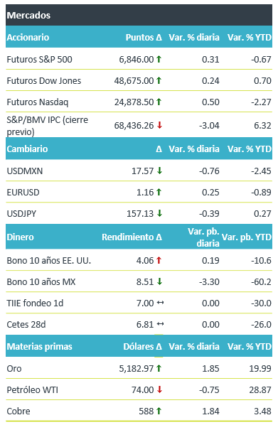 +Los futuros de los principales índices accionarios en los EE. UU. rebotan luego de dos jornadas de fuerte liquidación. En Europa, los mercados se recuperan (El Euro Stoxx 50 sube +1.9%) ante la moderación en el precio del petróleo. Mientras que en Asia los índices cerraron negativos, con el Kospi de Corea del Sur cayendo 12.06%, dada la mayor dependencia de las economías asiáticas hacia las importaciones de crudo y ante las tensiones comerciales con los EE. UU. El rendimiento a 10 años de los bonos del tesoro suben por tercera jornada consecutiva, si bien en el margen, reflejando aún preocupaciones sobre la inflación. El USDMXN se aprecia 0.76% hasta los $17.57, luego de presionarse hasta $17.70 durante la madrugada y registrar máximos de dos meses, moderándose ante el ajuste a la baja de 0.25% en el índice dólar. Respecto a materias primas, el precio de petróleo WTI baja 0.75% luego de haber alcanzado máximos nos vistos desde junio pasado, mientras el oro sube 1.85% luego de la caída de la jornada previa.