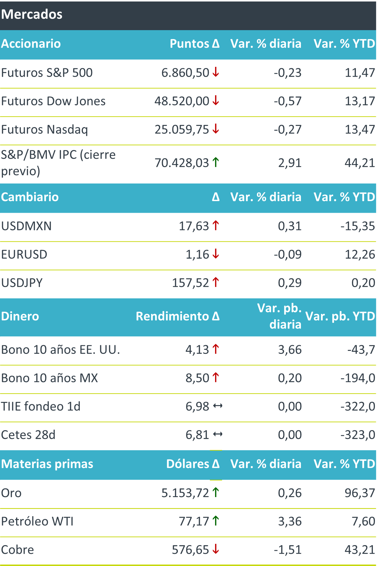 +Los futuros de los principales índices estadounidenses operan a la baja, reflejando una mayor aversión al riesgo ante la posibilidad de que el conflicto regional escale a global y, especialmente, por la preocupación sobre su impacto en la inflación y en las cadenas globales de suministro. La ola de ventas de los bonos del Tesoro a 10 años no dio tregua, impulsando un alza de alrededor de 3 puntos básicos en sus rendimientos; en Europa, las caídas fueron aún más marcadas: los bonos alemanes encadenaron su peor semana del año, reflejando el impacto que los elevados precios de las materias primas energéticas podrían tener sobre la inflación. El índice dólar se fortalece ante el contexto de cautela. El fortalecimiento en realidad se da de manera generalizada contra monedas emergentes y mercados desarrollados. El USDMXN continúa escalando relacionado con el debilitamiento generalizado de las monedas frente al dólar. El petróleo y los precios del gas natural en Europa siguen escalando, pero a ritmo más moderado, aunque se advierte que los riesgos de una crisis en los precios puede ser mayúscula en caso de alargamiento del cierre del Estrecho de Ormuz. Finalmente, los altos rendimientos y fuerza en el dólar afectan al oro.