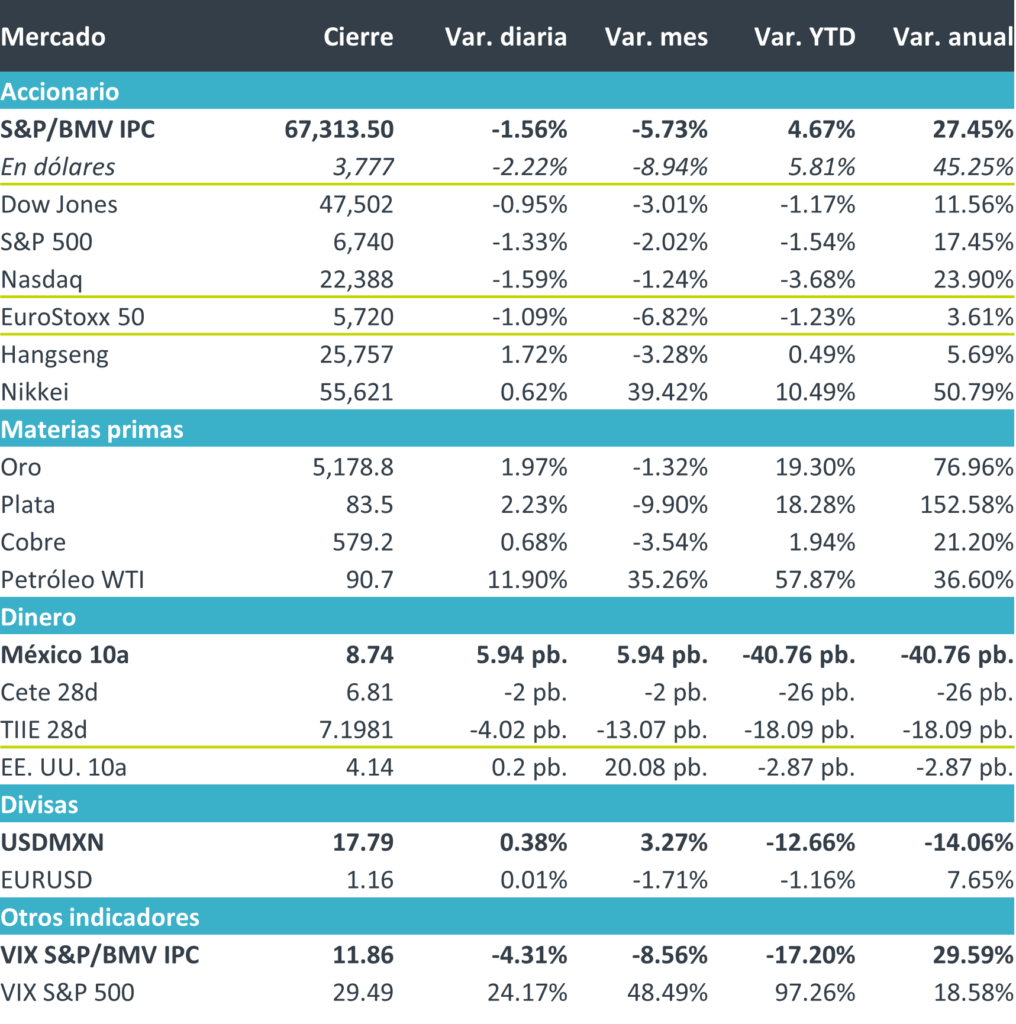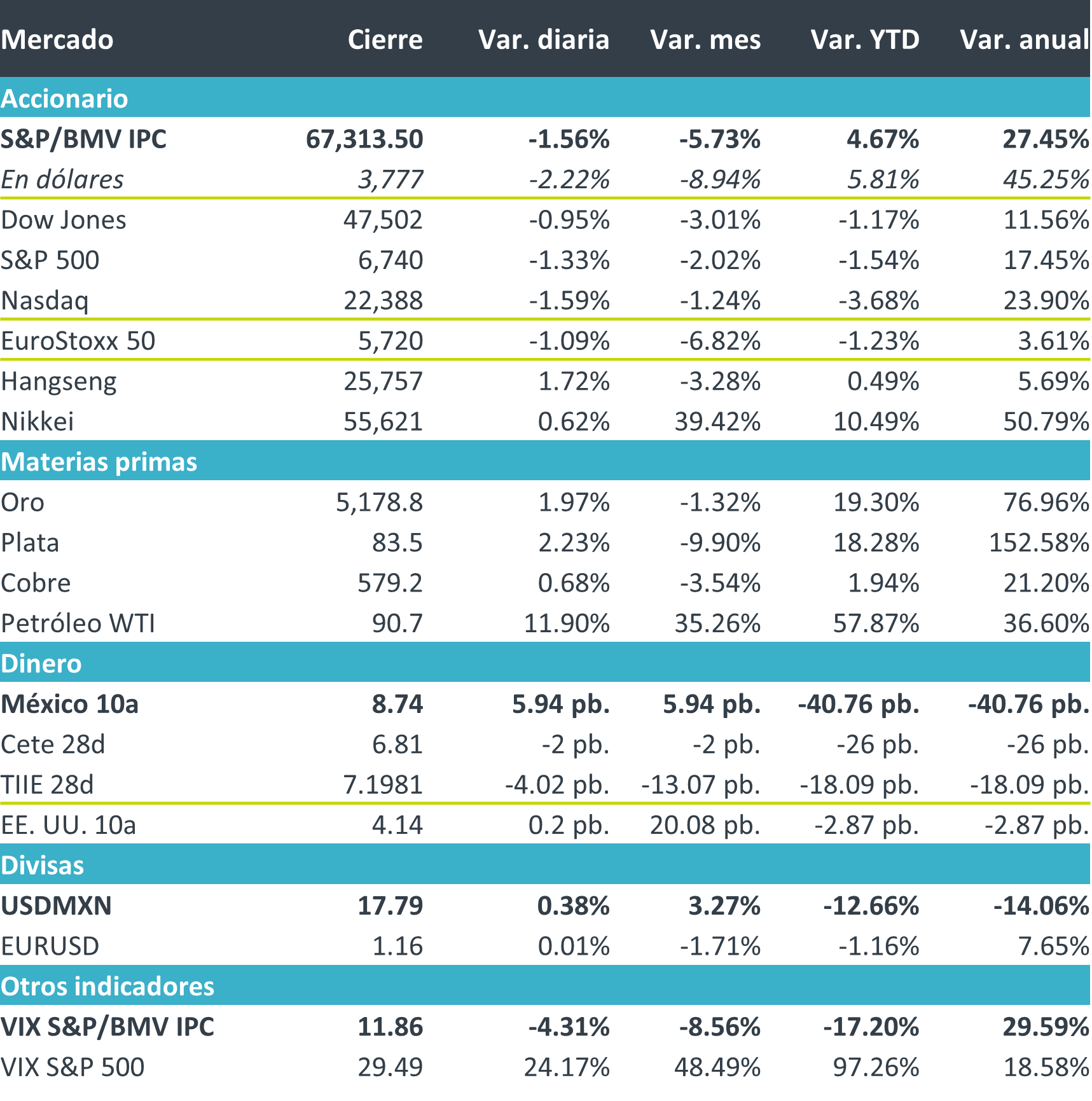 +Fue una jornada de caídas que prolongó el sentimiento bajista desde la apertura. Como resultado de la guerra, las alzas en los energéticos alcanzaron máximos históricos; el nerviosismo persistió por el escepticismo y la cautela en la inversión en inteligencia artificial, y por señales de enfriamiento laboral en EE. UU. Estos factores dominaron la narrativa de la jornada y llevaron a que, en la primera semana de este conflicto bélico, el S&P 500 registrara su peor desempeño semanal desde octubre. Todo ello aumentó la aversión al riesgo y siguió nublando el parabrisas de la conducción de la política monetaria de la Fed