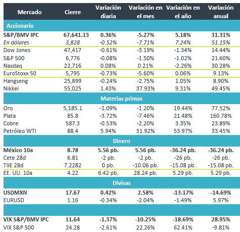+El precio del petróleo (WTI) subió 5.9%, finalizando en $88.4 dpb, el foco continua en las tensiones entre Irán y EE.UU., la Agencia Internacional de Energía anunció que liberará 400 millones de barriles de petróleo, por otro lado, el oro presentó un decremento de -1.1% terminando en un precio de $5,185.1 por onza.