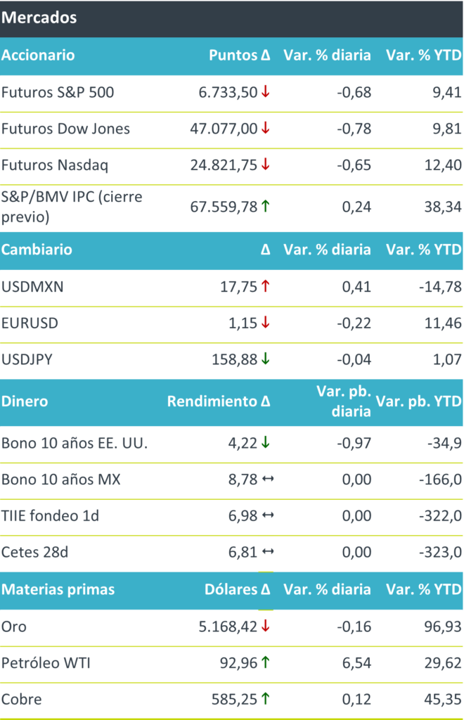 +Los futuros de los principales índices accionarios en los EE. UU. operan a la baja, reflejando cautela ante las preocupaciones de una turbulencia prolongada en los mercados energéticos producto de la guerra en Irán y sus ataques a infraestructura energética en el Golfo Pérsico, además de disrupciones en el Estrecho de Ormuz. El mismo sentimiento se observa en Europa, con el EuroStoxx 600 cayendo en 0.5%. El rendimiento a 10 años de los bonos del tesoro disminuyó marginalmente, con las nuevas solicitudes por seguro de desempleo ligeramente por debajo de las expectativas y menores a la semana anterior, colocándose aquellos como refugio ante los riesgos latentes derivados de la guerra en Medio Oriente. El USDMXN aumenta principalmente derivado de la búsqueda por parte de los inversionistas de refugio en monedas seguras, lo que se alinea con el aumento observado del índice dólar que avanza 0.66%. Respecto a materias primas, el precio de petróleo WTI sigue aumentando ante el conflicto en curso en Medio Oriente y su intensificación. El oro, por su parte, cae ante la predominancia del dólar y los bonos como activos seguros.