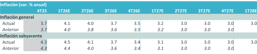 El Banco Central volvió a subir su pronóstico de inflación general y –por octava ocasión al hilo– del subyacente. En este caso, el ajuste fue para el periodo 1T26-3T26, por lo que todavía prevé que la variable converja a la meta de 3% en el 2T27. Se explicó que el cambio incorporó un mayor nivel en la inflación no subyacente y la renuencia en los servicios. El balance de riesgos mantiene un sesgo al alza; ya no se refirió que “es más equilibrado”, como en febrero, conforme cobra relevancia el posible efecto del conflicto en Medio Oriente, que “añade incertidumbre a las previsiones”.