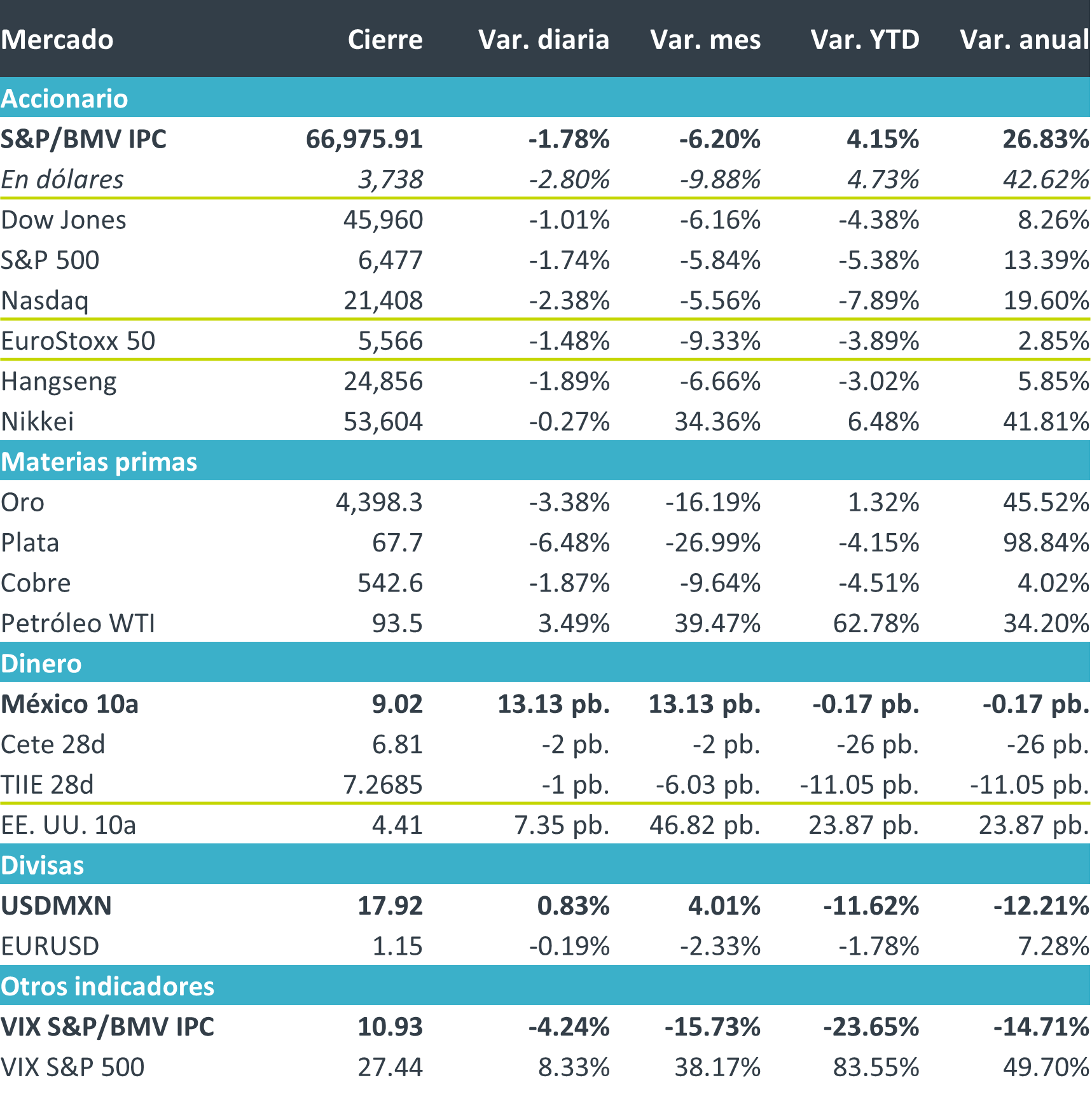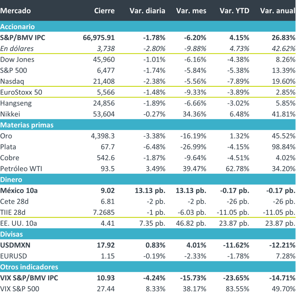 +Fue una jornada de caídas en los principales índices accionarios y elevada volatilidad ante la ausencia de un cese al fuego claro o cercano en Oriente Medio, dada la resistencia de Teherán y Washington a los términos propuestos. Al acercarse el cierre de la cuarta semana de operaciones tras la acción conjunta de Israel y Estados Unidos en Irán, el petróleo se mantiene al alza y persisten disrupciones en las cadenas globales de suministro de crudo y de insumos críticos (por ejemplo, helio para microchips). Ello deriva en presiones inflacionarias globales y, en consecuencia, mayor aversión al riesgo ampliamente reflejada en los mercados.
