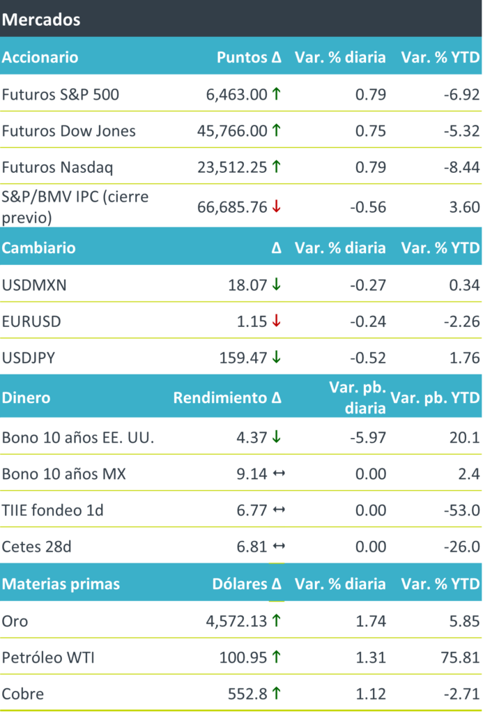 +Los futuros de los índices accionarios estadounidenses y los mercados europeos (Euro Stoxx 50 +0.4%, FTSE 100 +1.0%) avanzan al tiempo que el presidente Trump refiere progresos en las negociaciones con Irán y ante el respiro en los rendimientos de los bonos. En el mercado de dinero, posiblemente incorporando el temor de un debilitamiento económico mundial a raíz de las disputas geopolíticas. Los rendimientos a 10 años de los bonos del tesoro toman un respiro luego tocar la semana pasada máximos desde julio de 2025. El índice dólar (+0.2%) se mantiene en su mejor nivel desde mayo. Al interior de la canasta de las principales divisas, destaca que solo el peso mexicano, el real brasileño y el yen japonés se aprecian contra el dólar, con el yen impulsado por declaraciones de funcionarios japoneses en relación a una posible intervención en el mercado cambiario. Los precios del petróleo continúan presionándose, con el WTI superando los 100 dpb. por primera vez desde julio de 2022. Los precios del aluminio se fortalecen luego de que Irán atacara a unas fundidoras en Medio Oriente. El oro extiende las ganancias del viernes.