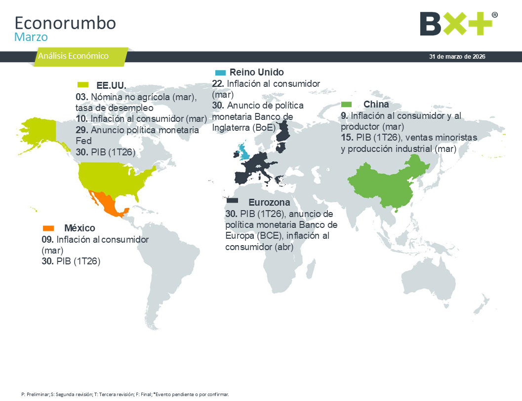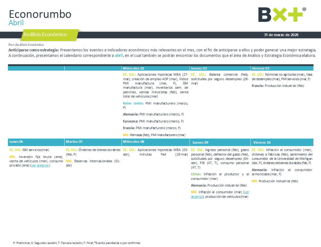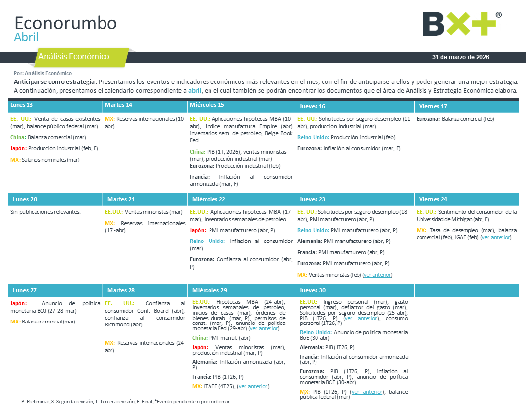 Anticiparse como estrategia: Presentamos los eventos e indicadores económicos más relevantes en el mes, con el fin de anticiparse a ellos y poder generar una mejor estrategia. A continuación, presentamos el calendario correspondiente a abril, en el cual también se podrán encontrar los documentos que el área de Análisis y Estrategia Económica elabora.