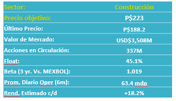 Iniciamos Cobertura de GCC (GCC “*”) con un Precio Objetivo de MXN$223 por acción, lo que implica un rendimiento de 18.2% respecto al último cierre, por lo que recomendamos COMPRA.