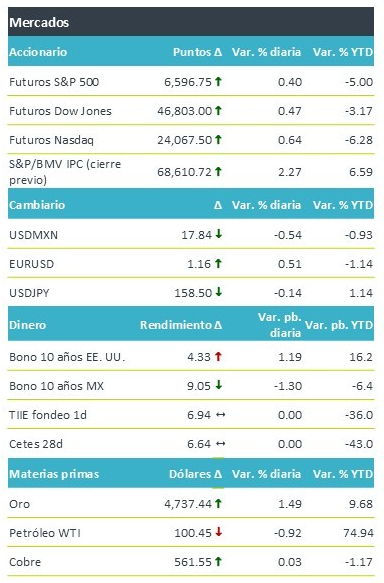 +El sentimiento positivo de los mercados continúa este miércoles debido a la esperanza del fin del conflicto en Medio Oriente, lo que ha liberado presiones en los precios de energéticos y renovado el apetito por activos de riesgos en los mercados. Las declaraciones del presidente D. Trump del día de ayer respecto a detener los ataques incluso si se mantiene cerrado el estrecho de Ormuz, genera optimismo, además se espera que en su discurso en la noche siga alentando el fin de la guerra. Por otro lado, los datos económicos de empleo ADP y ventas minoristas mejores a lo esperado reflejaron la resiliencia del mercado laboral y del consumo en EE. UU.