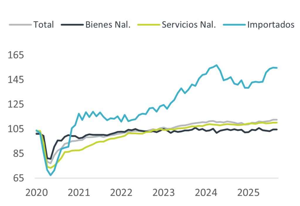 La pérdida de tracción de enero fue generalizada entre los componentes del indicador. Destacó la corrección en bienes importados (-6.8% m/m), un componente que había mostrado mayor soporte en la segunda mitad de 2025. En términos anuales, el rubro se mantuvo elevado (+12.2% a/a), en parte por una base de comparación baja. El componente nacional también retrocedió (-0.7% m/m), con caídas en bienes (-0.9% m/m) y servicios (-0.5% m/m). A tasa anual avanzó apenas 0.4%: bienes sin crecimiento, y servicios tan solo se expandieron 0.8%. Es posible que el movimiento en bienes importados haya sido consistente con un efecto de normalización tras las compras adelantadas hacia el cierre de 2025, ante la expectativa de cambios arancelarios al inicio de 2026.