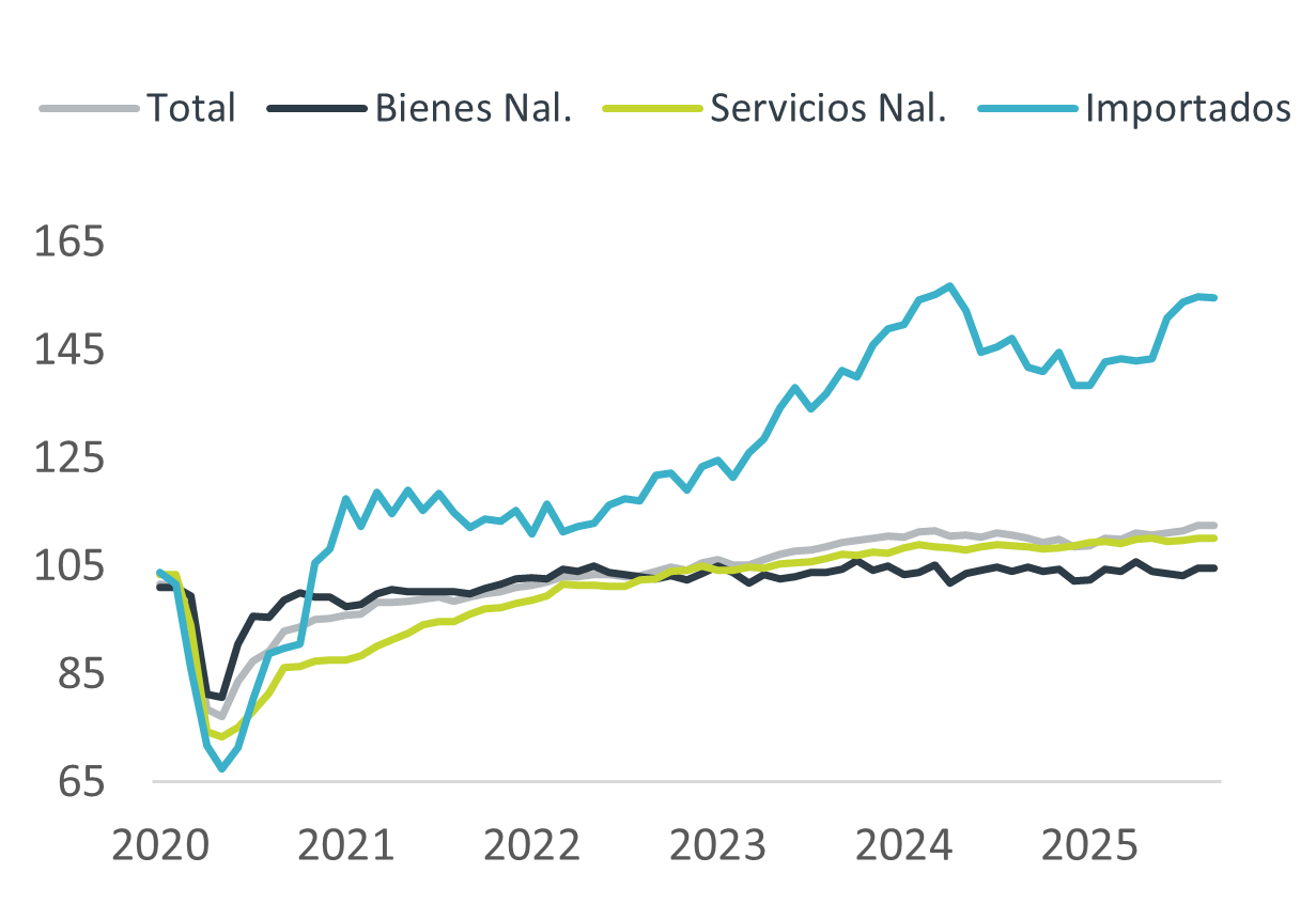 La pérdida de tracción de enero fue generalizada entre los componentes del indicador. Destacó la corrección en bienes importados (-6.8% m/m), un componente que había mostrado mayor soporte en la segunda mitad de 2025. En términos anuales, el rubro se mantuvo elevado (+12.2% a/a), en parte por una base de comparación baja. El componente nacional también retrocedió (-0.7% m/m), con caídas en bienes (-0.9% m/m) y servicios (-0.5% m/m). A tasa anual avanzó apenas 0.4%: bienes sin crecimiento, y servicios tan solo se expandieron 0.8%. Es posible que el movimiento en bienes importados haya sido consistente con un efecto de normalización tras las compras adelantadas hacia el cierre de 2025, ante la expectativa de cambios arancelarios al inicio de 2026.