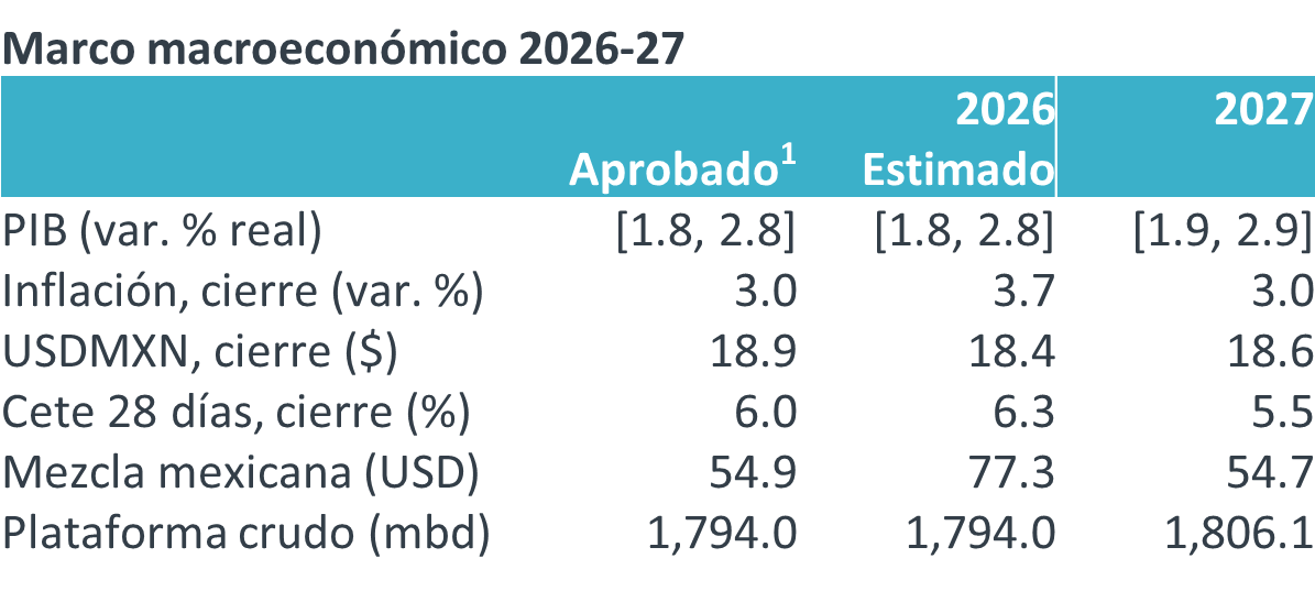 La SHCP mantuvo la previsión de crecimiento del PIB y volumen de la plataforma petrolera. Incorporó precios del petróleo, inflación y tipos de interés más altos, y un tipo de cambio más apreciado