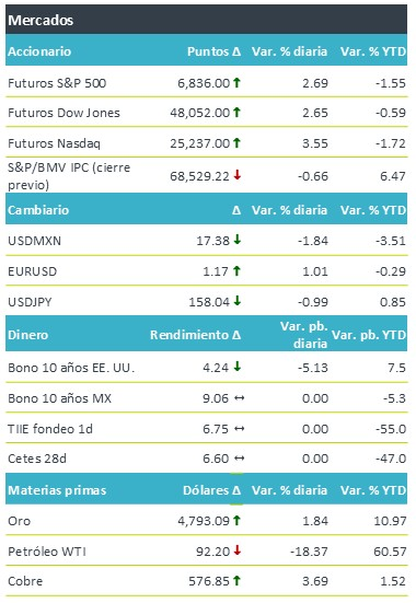 +Los futuros de los principales índices accionarios en los EE. UU. suben eufóricamente ante el optimismo de un alto al fuego, que ha renovado con fuerza el apetito por activos de riesgo. En Europa, los mercados operan al alza ante el sentimiento generalizado (Euro Stoxx 50 +5.4%), mientras que en Asia los índices cerraron con avances. El rendimiento a 10 años de los bonos del tesoro retrocede 5.1 pb hasta 4.24%, ante la reducción del riesgo global y el menor temor inflacionario; ello también llevó a los bonos europeos a bajas de hasta 20 pb. El USDMXN se aprecia 1.8% hasta $17.38, ante la caída de 1.3% del índice dólar, su menor nivel en un mes, por una menor demanda por refugio. Respecto a materias primas, el precio de petróleo WTI presenta caídas de doble dígito ante el acuerdo para reabrir el estrecho de Ormuz, lo que alivia las presiones en la oferta de crudo, aunque todavía se cotiza casi +40% de los niveles vistos antes del conflicto. El oro por su parte aumenta 1.8% ante el descenso de los bonos y del dólar.