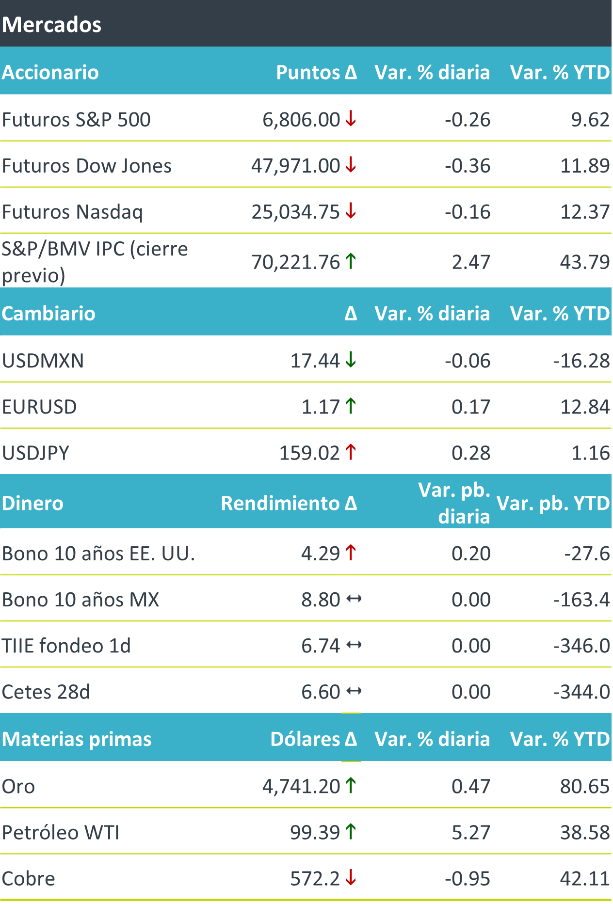 +Ayer se publicaron las minutas de la última reunión del Fed. Resaltaron que el mantenimiento en la tasa se debió en gran parte a la persistente inflación que podría amplificarse ante el conflicto en Irán. Una creciente parte del Comité advirtió sobre un escenario de alza de tasas en el futuro; otros alertaron que un conflicto prolongado afectaría al empleo y llevaría a recortes en la tasa de interés.