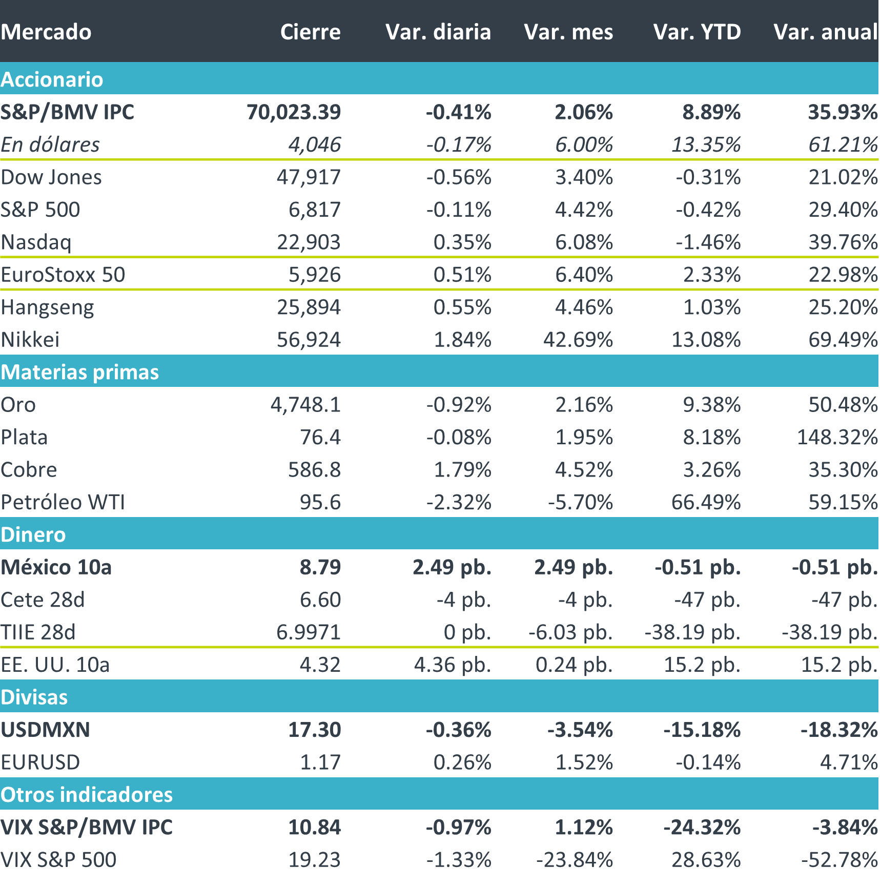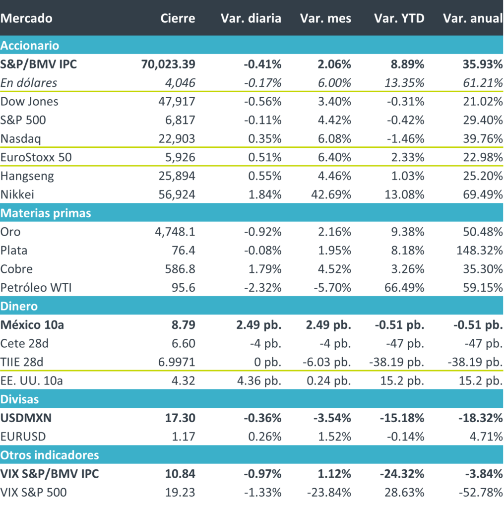 +En materias primas, el oro cedió. Mientras que el rendimiento en los bonos del tesoro de EE.UU., aun que iniciaron a la baja tras la publicación del dato de inflación terminaron por rebotar tras tensiones y presiones inflacionarias tanto en el frente energético como comercial tras una mayor inflación al productor en China. El petróleo cerró la semana con su peor caída desde 2020 como respuesta al cese al fuego en Irán.