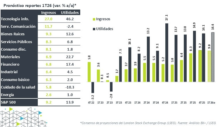 De acuerdo con el consenso, se proyecta que el S&P 500 registre un aumento de 9.0% a/a en ingresos, liderados por el sector de tecnología de la información. Por otro lado, se estima un crecimiento de 14.4% a/a en utilidades, respaldado por los incrementos en los sectores tecnológico y de materiales.