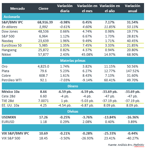 +El precio del petróleo (WTI) cayó 7.0%, finalizando en $92.1 dpb, lo anterior como consecuencia de la posibilidad de un acuerdo que ponga fin al conflicto en Medio Oriente. Por otro lado, el oro presentó un incremento de 2.1% terminando en un precio de $4,842.80 por onza.