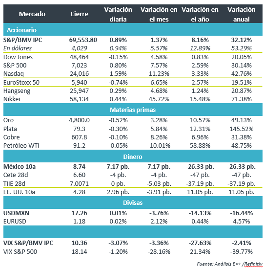 +El precio del petróleo (WTI) cayó 0.05%, finalizando en $91.2 dpb, lo anterior como consecuencia de la probabilidad de un acuerdo que ponga fin al conflicto, cabe resaltar que circula en medios que existe la posibilidad de una extensión de dos semanas del alto al fuego. Por otro lado, el oro presentó un decremento de 1.0% terminando en un precio de $4,792.28 por onza.