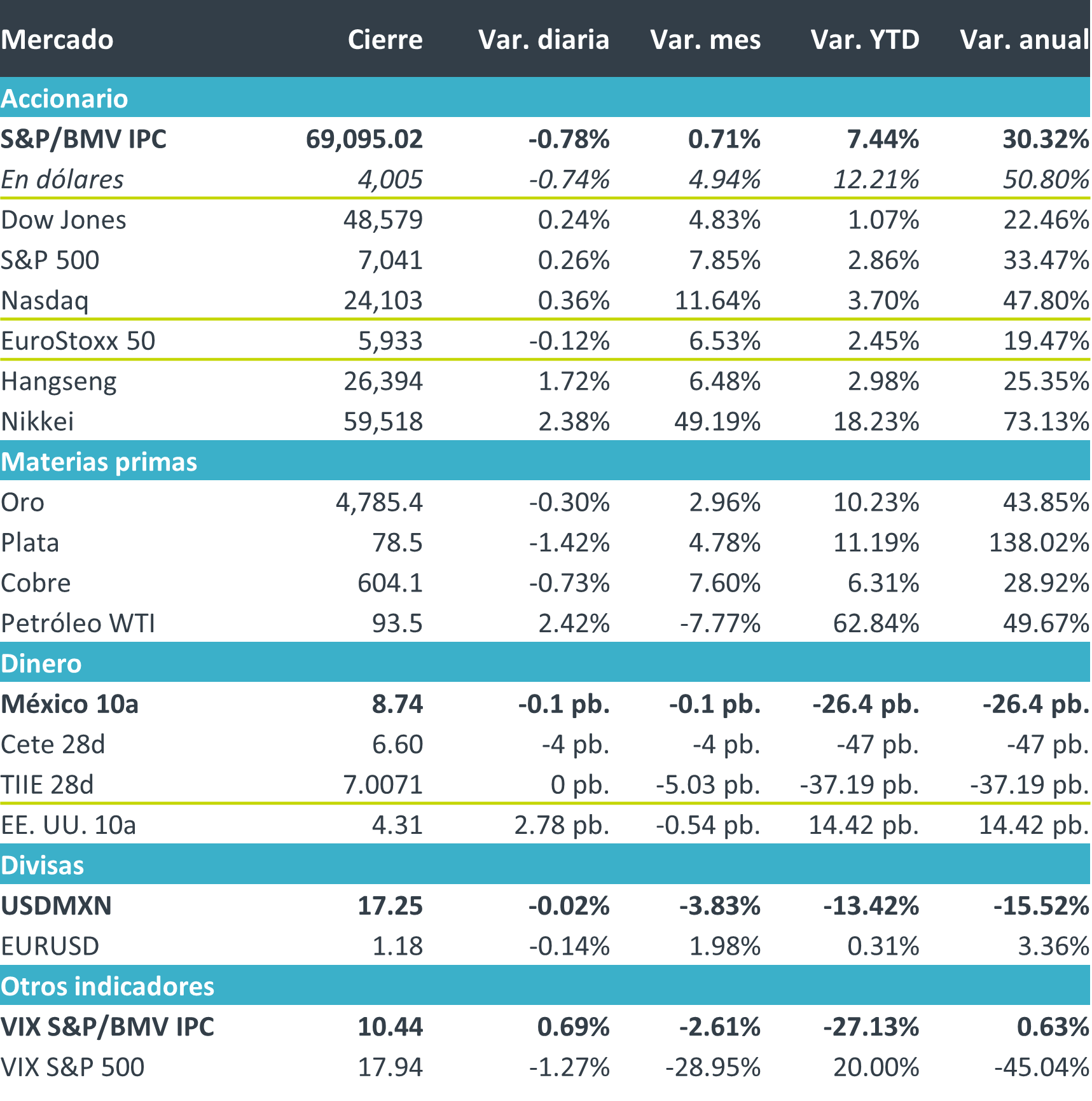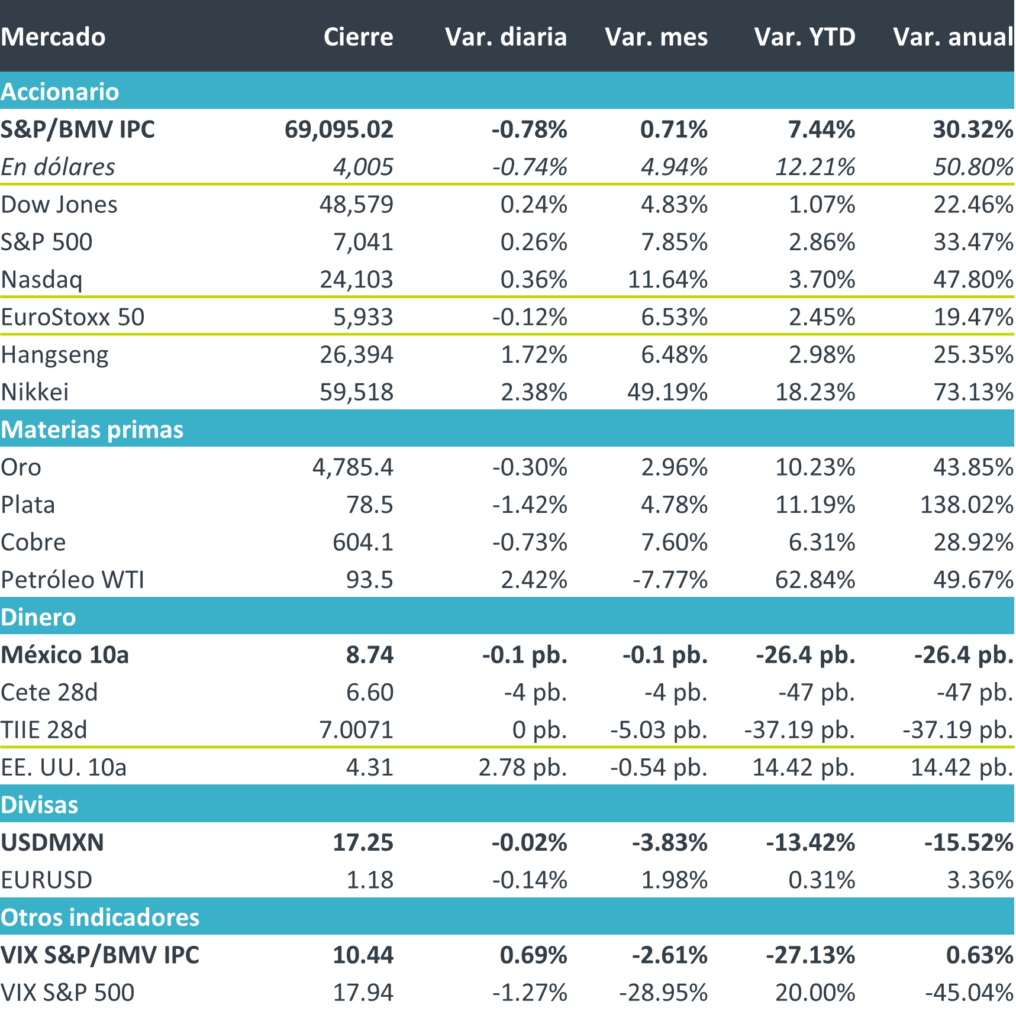 +Fue una jornada de ganancias generalizadas en el mercado accionario, impulsada por un mayor optimismo en torno al panorama geopolítico y militar en el Golfo. Esto, tras comentarios de Donald Trump sobre un posible acuerdo cercano y concesiones por parte de Irán, así como el anuncio de una tregua de 10 días entre Israel y Líbano. A lo anterior se sumó el tono alcista del sector tecnológico, apoyado por los reportes de TSMC, que apuntaron a una demanda resiliente de chips vinculados a la Inteligencia Artificial. En este contexto, la influencia inmediata de los titulares de guerra sobre los mercados parece haberse debilitado: las señales mixtas se han vuelto la norma, el S&P 500 volvió a marcar máximos históricos hoy, después de que el miércoles superara por primera vez el nivel de los 7,000 puntos. El apetito por riesgo se mantiene sólido; sin embargo, algunas autoridades de organismos con sede en Washington señalaron que los mercados podrían estar subestimando el impacto potencial del conflicto.