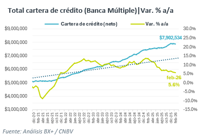 Sistema financiero. La cartera de crédito neto de la Banca Múltiple, con cifras de la CNBV, reportó un aumento de 5.6% a/a en febrero, continuando con la tendencia de desaceleración de meses previos. Lo anterior refleja aún la elevada base de comparación, y el débil ritmo de la economía mexicana. A tasa mensual, la cartera de crédito se contrajo 0.01%, muy estable, pero hilando dos meses con variaciones negativas.