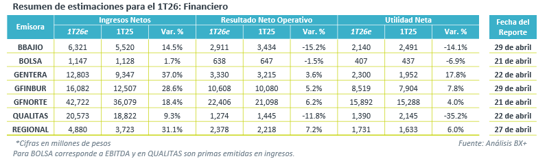 REGIONAL. Para el 1T26 se estima un incremento de 31.1% a/a en margen financiero, ante una mayor captación de cuentas a nivel regional, mientras que se proyecta que el resultado operativo aumente 7.2% y la utilidad neta mejore un 6.0% a/a.