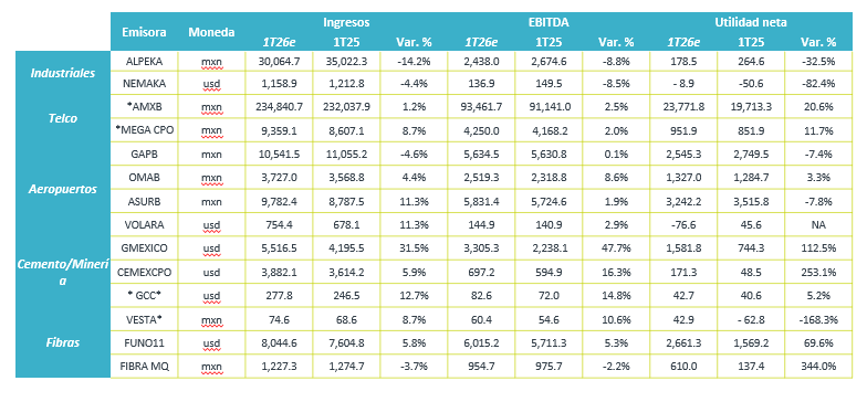 Volaris. El consenso espera un incremento en ventas de 11.3% a/a para el primer trimestre de 2026, los resultados se verán impulsados derivado de un incremento en el en tráfico de pasajeros acumulado en lo que va del año, principalmente por el internacional recuperándose de los efectos adversos por temas migratorios vistos a principios del 2025. Cabe mencionar que en 2026 el Capex en gran parte será utilizado para el mantenimiento de los aviones que serán devueltos al arrendador. Por otro lado, continua el proceso de la creación de un grupo de aerolíneas mexicanas en donde participarían tanto Volaris como Viva aerobús y aunque aún está sujeta a aprobación sugerimos estar pendientes ya que esto podría fortalecer su capacidad de negociación.