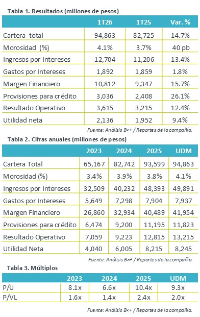 Crecimiento de cartera. La cartera total de Gentera fue de $94,863 mdp en el 1T26, creciendo 14.7% a/a, superando lo reportado por el sector, esto debido al desempeño de sus subsidiarias: Banco Compartamos (+18.8%), Compartamos Banco de Perú (+5.8%) y ConCrédito de México (+14.1%). Sin embargo, resalta el aumento de 40 pb en cartera vencida, quedando en una tasa de morosidad de 4.1%.