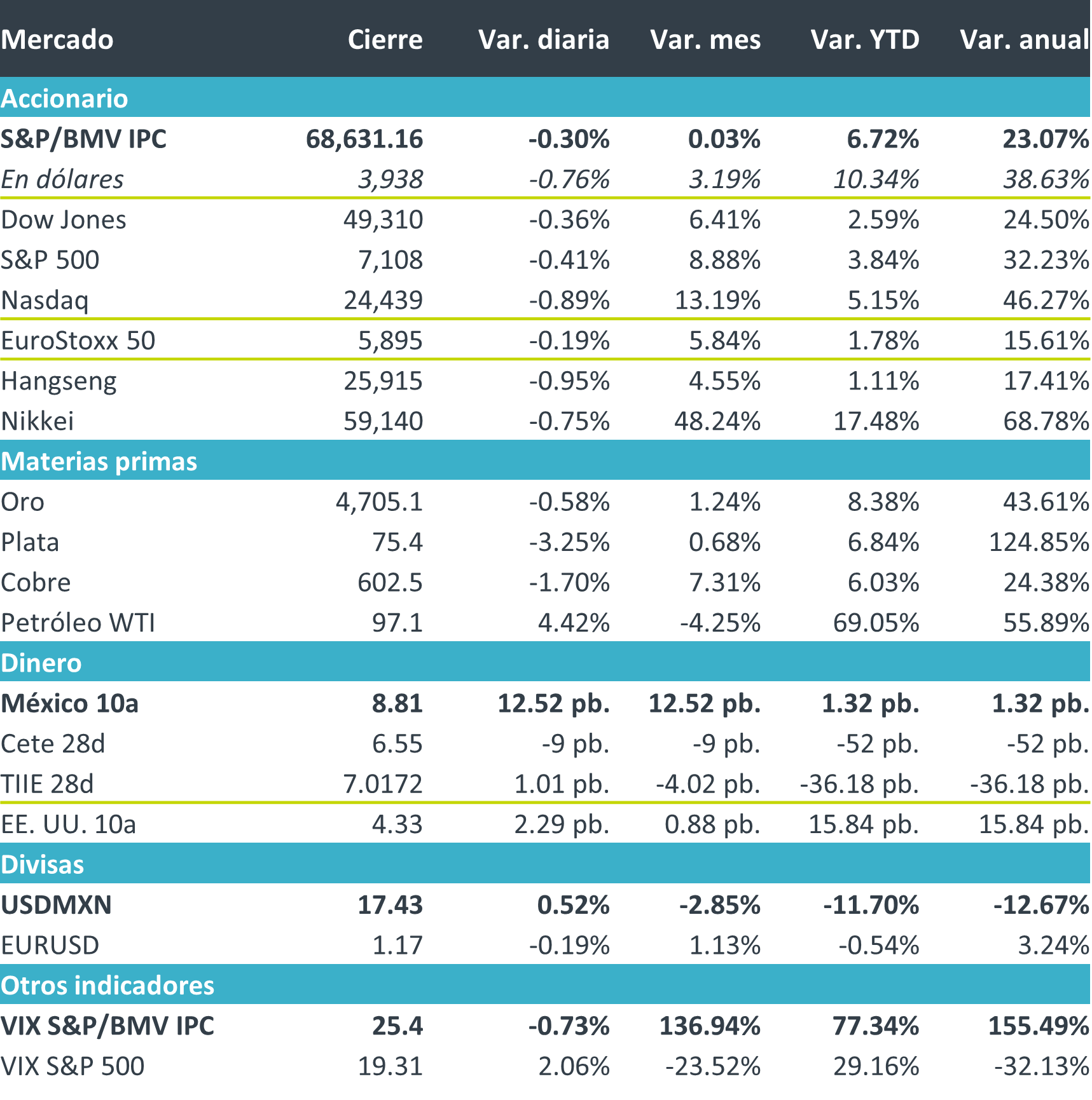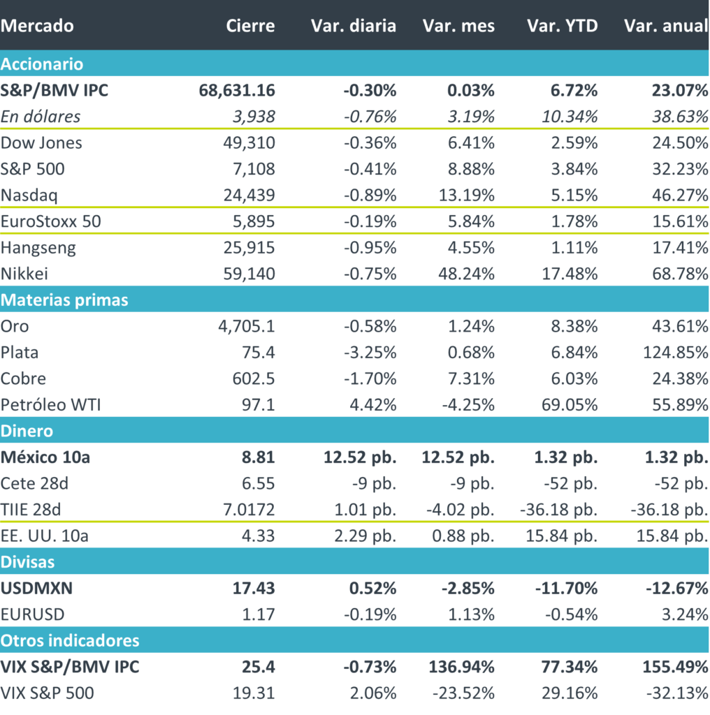 +Fue una jornada de pérdidas generalizadas en el mercado accionario, derivadas de la incertidumbre sobre las implicaciones, la magnitud y la duración de la escalada del conflicto bélico en Oriente Medio, tras declaraciones desde EE. UU. recibidas con escepticismo y percibidas como de mayor agresividad. El mercado reaccionó con cautela, aunque el nerviosismo se vio parcialmente contenido por una economía estadounidense resiliente y por utilidades corporativas sólidas: cerca de 80% de los reportes trimestrales publicados hasta ahora han superado las estimaciones. Sin embargo, el sector de software destacó por su debilidad, presionado por resultados decepcionantes de IBM, que el mercado interpretó como señal de mayores disrupciones asociadas a la IA en la industria. Aun con la corrección de hoy, el S&P 500 apunta a su mejor mes desde 2023.