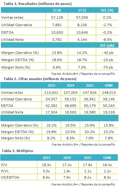 México refuerza. Las ventas netas subieron marginalmente 0.2% a/a en el 1T26, (+8.8% sin efecto de tipo de cambio), principalmente afectado por la caída en ventas en Estados Unidos (-3.6%, o +12.6% en moneda local) y de Sudamérica (-7.2%), que logró ser compensado por el crecimiento en México (+7.4%). Esto ante el desempeño en volumen y al alza en el precio promedio en México (+5.8%) y en EE.UU. (+3.5%).