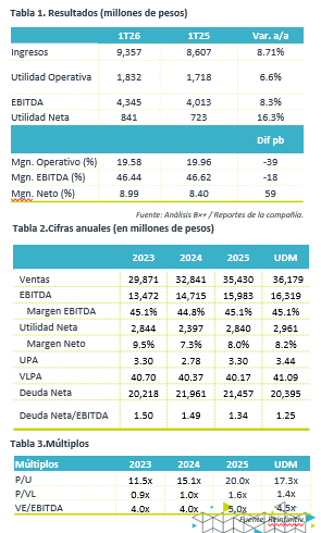 Valuación. En términos de apalancamiento registraron una disminución vs cierre del 2025 como consecuencia de una mayor generación de EBITDA y menor Deuda Neta. En CAPEX invirtieron MXN$1,989 millones en línea con lo esperado. En múltiplos, la compañía cotiza en PU a 17.3x LTM, lo que sería 16.9% mayor a su promedio de 5 años, así mismo en VE/EBITDA cotizan por arriba de su promedio 1.4%.