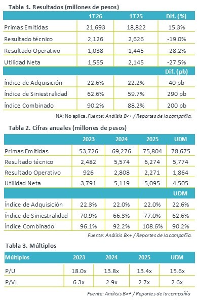 Trimestre mixto. La aseguradora refleja un sólido crecimiento en unidades aseguradas y primas emitidas, dirigiendo su estrategia a conservar participación de mercado. No obstante, la no acreditación del IVA presiona su índice de siniestralidad y el índice combinado, y mientras se estabiliza el efecto, podría ser un año de transición para la empresa.