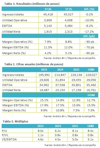 Afectaciones en el 1T26. Los ingresos totales de Puerto de Liverpool disminuyeron 0.2% a/a al 1T26, afectado por la división comercial que disminuyó 1.9% a/a, que opacó el crecimiento del negocio financiero (11.6% a/a) y el segmento inmobiliario (4.4% a/a).  La compañía mencionó que el desempeño fue afectado por los eventos de seguridad registrados en febrero, principalmente en Jalisco, generando cierres temporales e interrupciones en cadena de suministro, sumado a la cautela del consumidor.