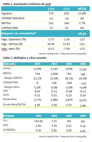 - Reporte complicado. Al 1T26, la compañía presentó un reporte débil, con un avance en ingresos, pero registrando una pérdida neta derivado de mayores gastos.