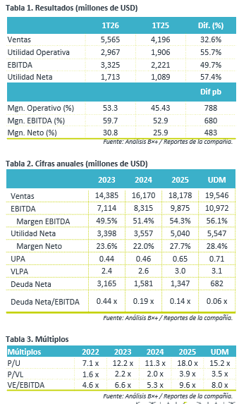 - Comienzan 2026 con récord. La empresa reportó un incremento en ventas de 32.6% a/a, impulsado principalmente por un buen desempeño en minería, favorecida por mejores precios de los metales e incremento en ventas de plata y zinc. A a lo anterior hay que sumarle un buen desempeño en Transportes. Este avance fue parcialmente contrarrestado por la caída en ingresos de la división infraestructura.